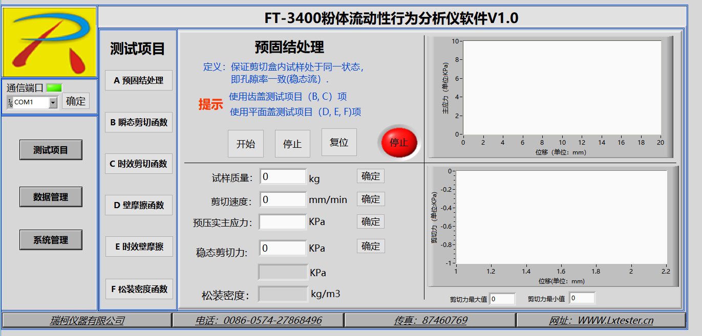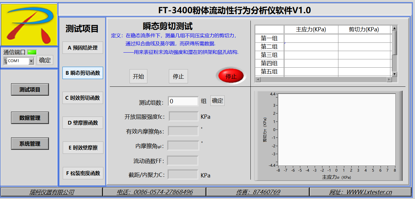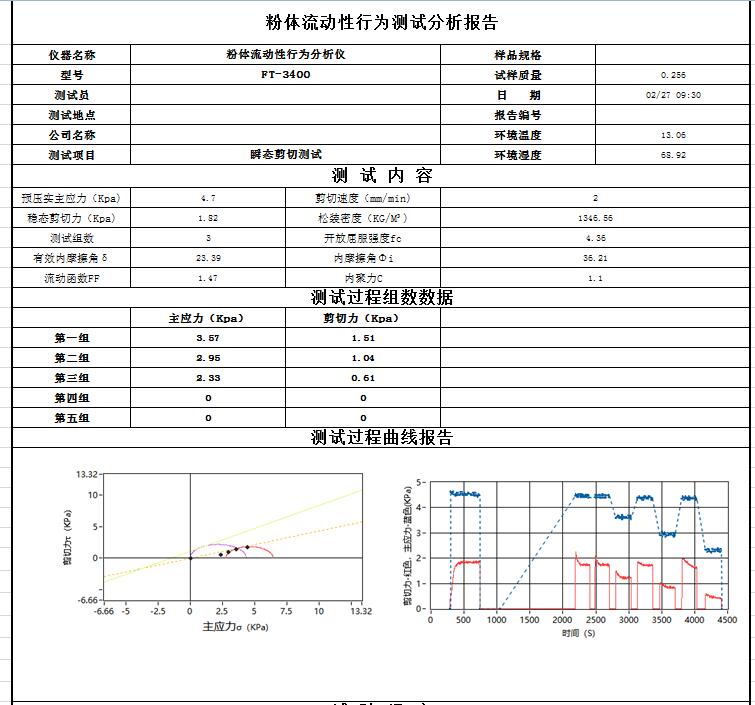 分析和測試如下數(shù)據(jù):莫爾應(yīng)力圓、內(nèi)摩擦角、主應(yīng)力、剪切力、屈服軌跡、穩(wěn)態(tài)流、流動函數(shù)、開放屈服強(qiáng)度(無側(cè)限屈服強(qiáng)度)、內(nèi)摩擦?xí)r間角、時效屈服軌跡、堆積密度、密度軌跡、壁摩擦角、附著力、壁剪切力、壁應(yīng)力、壁軌跡、運(yùn)動摩擦角、靜態(tài)摩擦角、料倉設(shè)計(jì)的料斗半頂角、卸料口徑、流與不流判定、流動因子、初始抗剪強(qiáng)度(內(nèi)聚力)等數(shù)據(jù)分析.